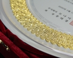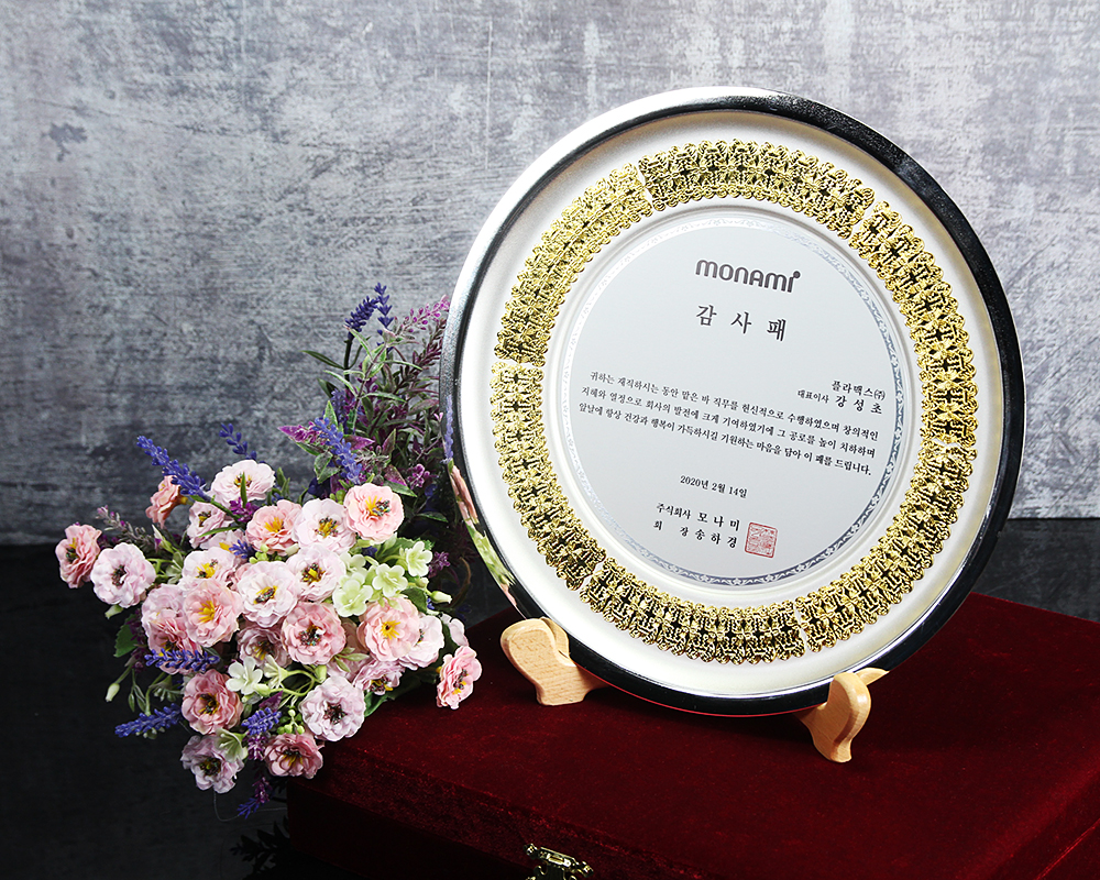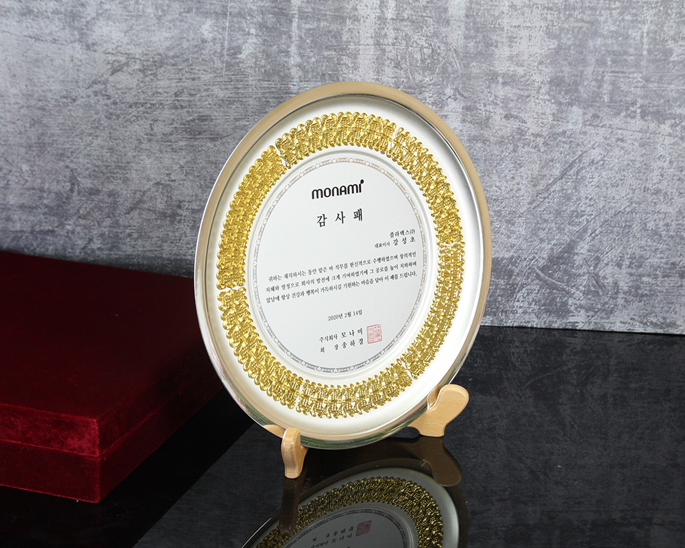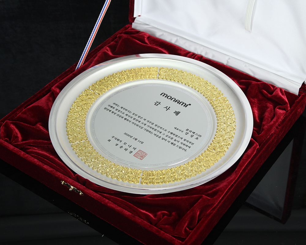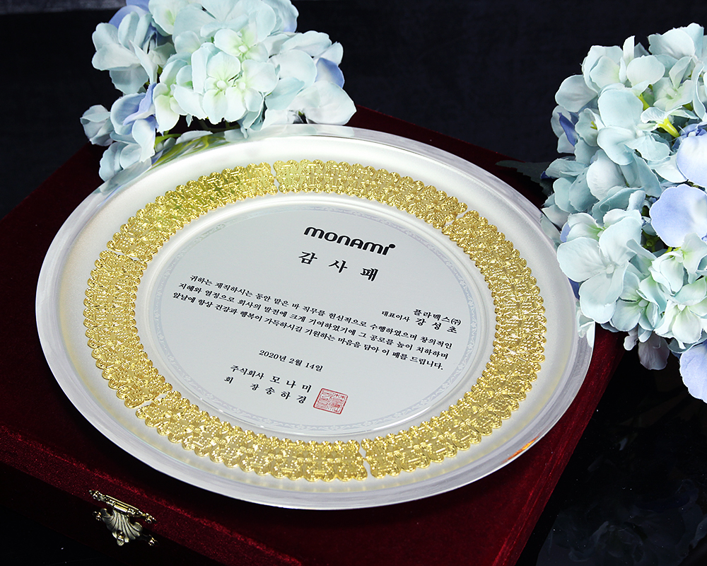 모나미에서 주문받아 제작한 쟁반형태의 감사패 입니다